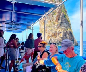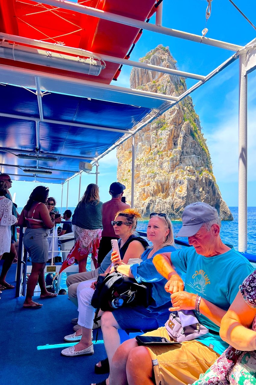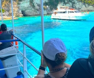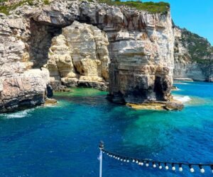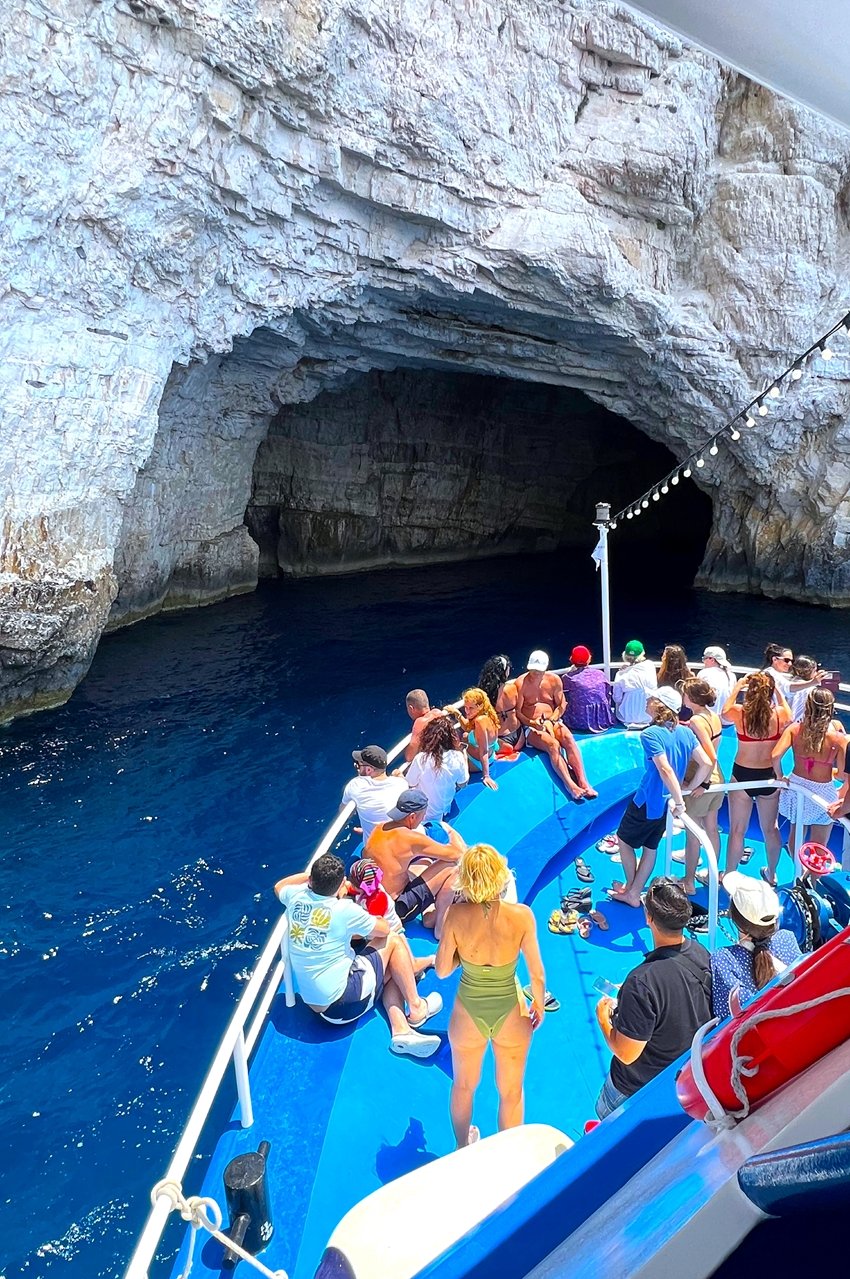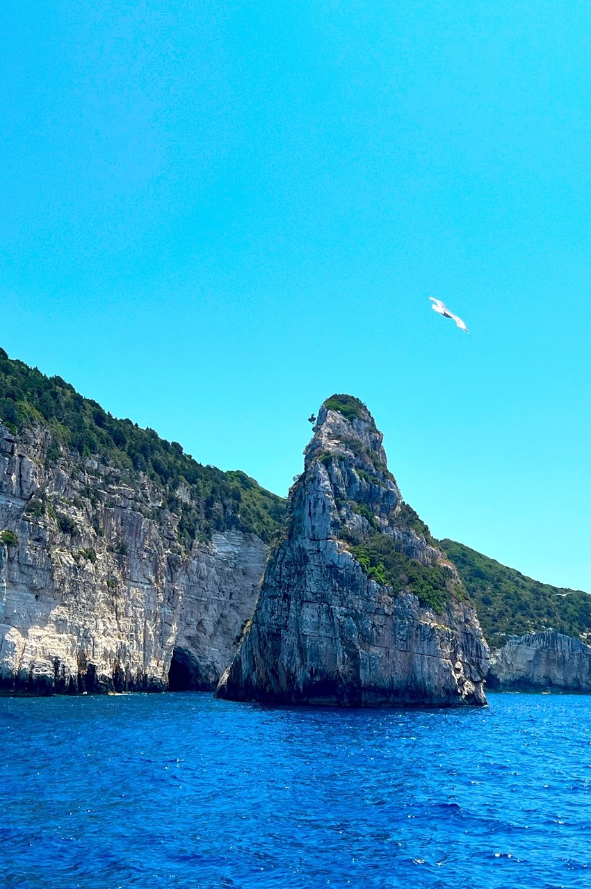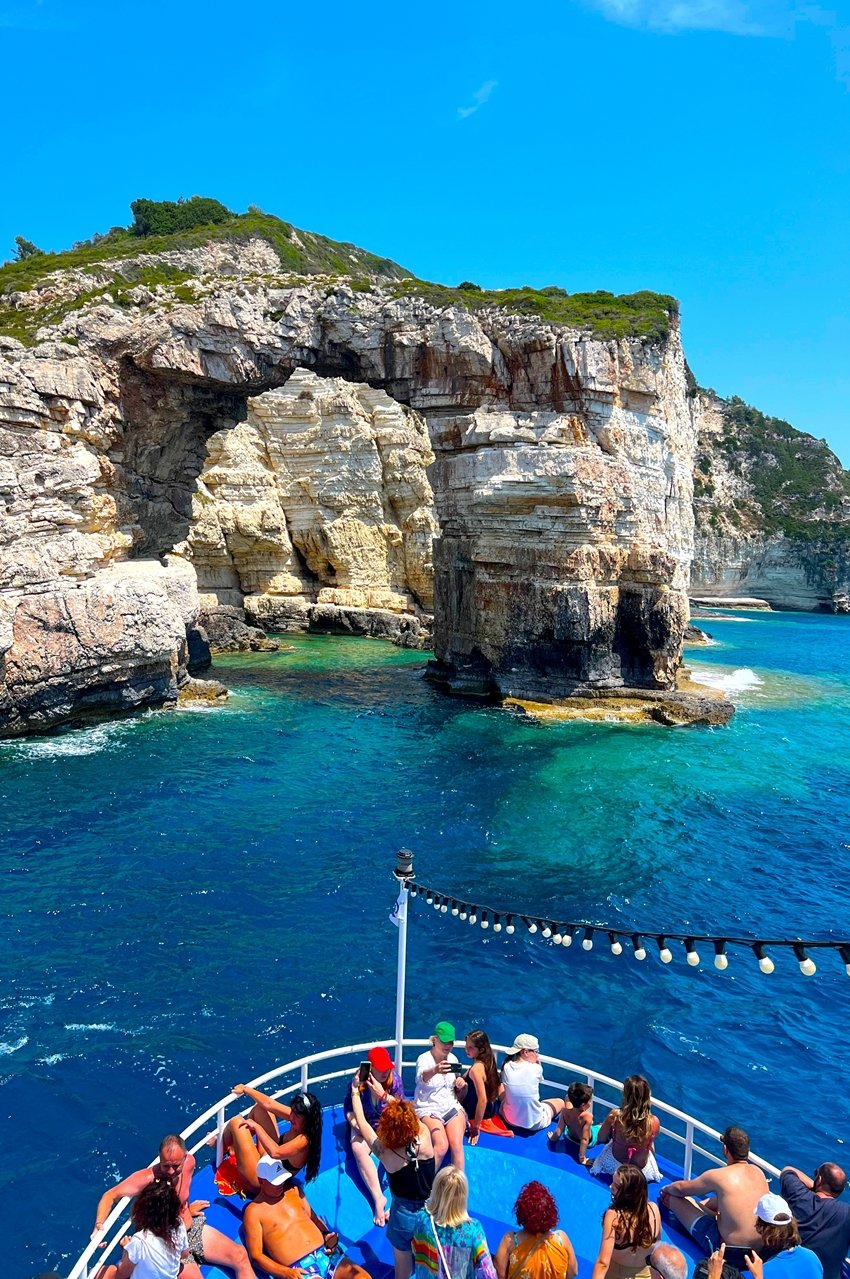 Μετά τους Αντίπαξους, το καράβι μάς πήγε σε μια μαγευτική περιήγηση γύρω από τους Παξούς. Συναντήσαμε γεωλογικά θαύματα – σπηλιές με απίθανους σχηματισμούς, απόκοσμους χρωματισμούς στα βράχια, κατακόρυφους γκρεμούς που βυθίζονται στο Ιόνιο. Οι πιο γνωστές από αυτές, οι «Γαλάζιες Σπηλιές», μοιάζουν σαν να φωτίζονται από μέσα, χάρη στην αντανάκλαση του ήλιου στα νερά.
