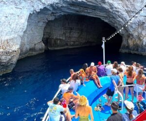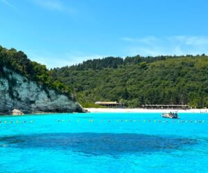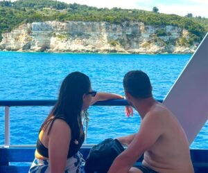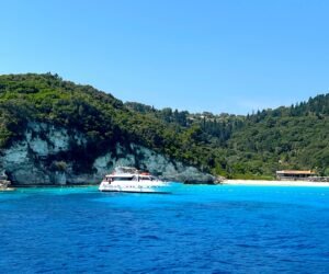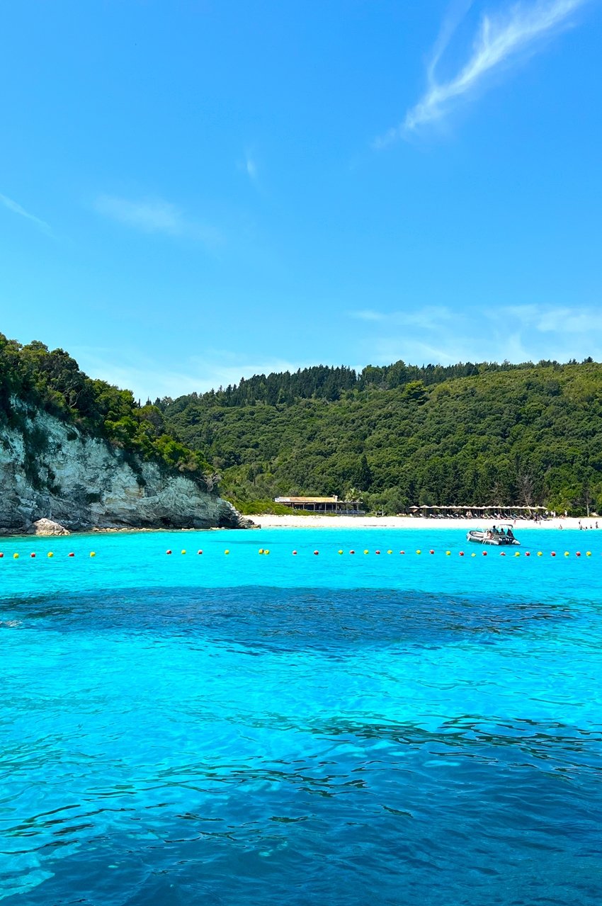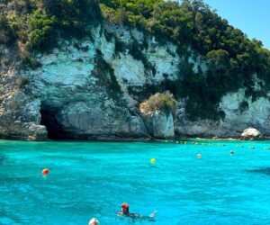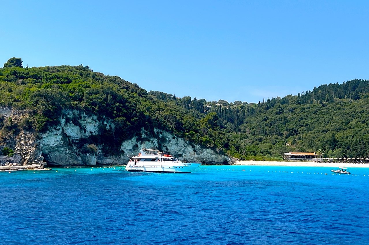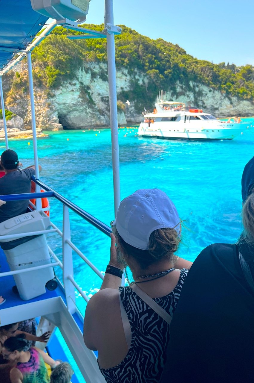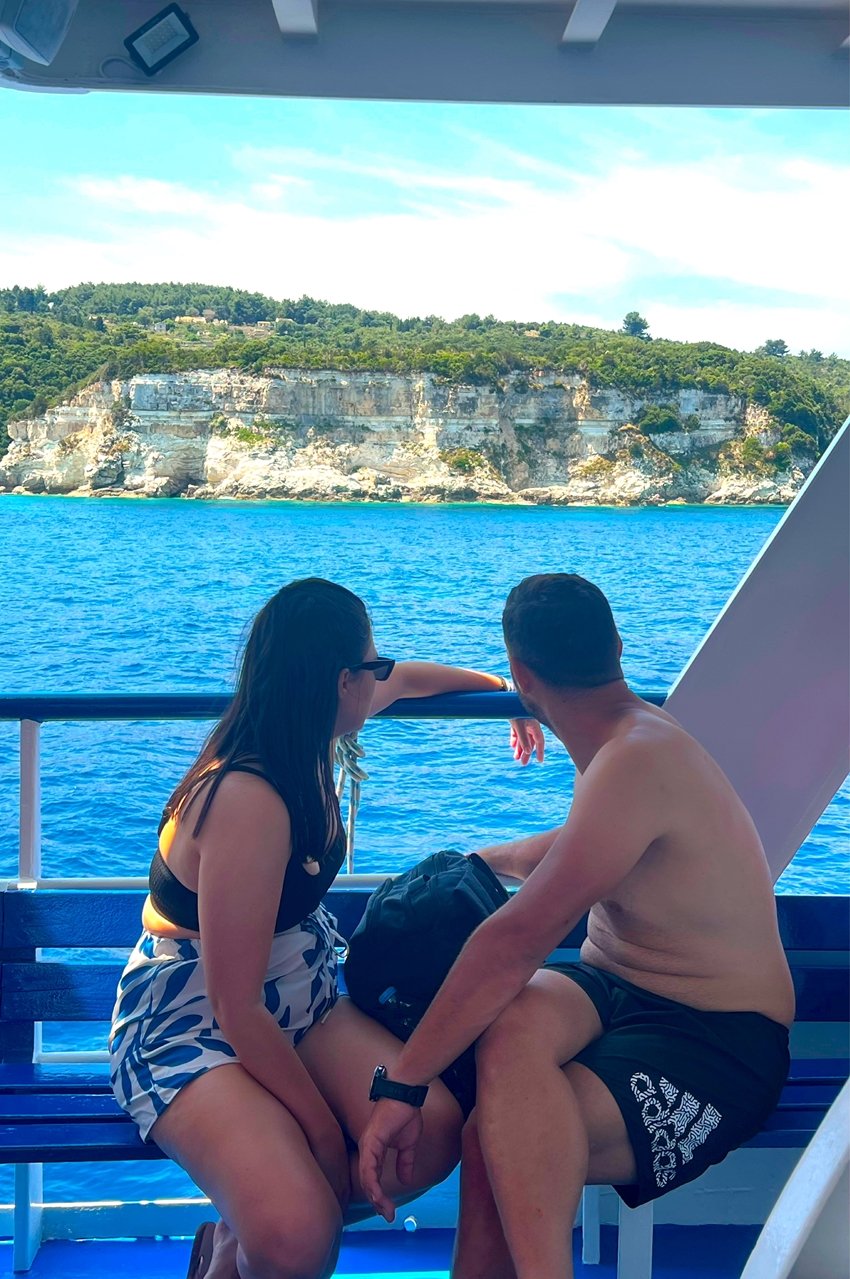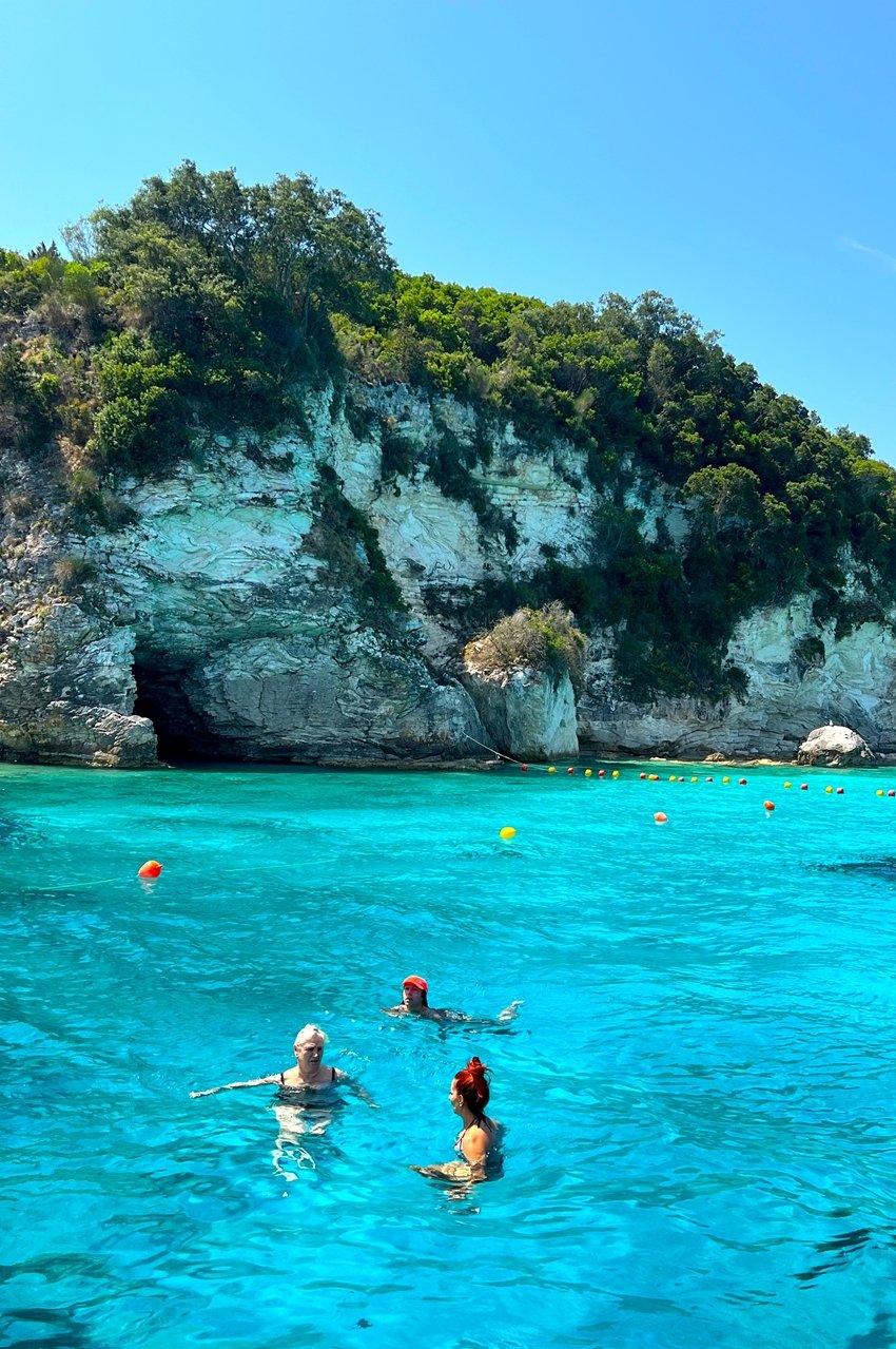 Ύστερα, πήραμε το καράβι και αφήσαμε πίσω μας τη στεριά για το γαλάζιο του Ιονίου. Κατευθυνθήκαμε πρώτα στους Αντίπαξους – έναν παράδεισο μικρών διαστάσεων αλλά τεράστιας φυσικής ομορφιάς. Τα νερά εδώ είναι σχεδόν εξωπραγματικά: διάφανα, τιρκουάζ, τόσο καθαρά που νιώθεις πως αιωρείσαι πάνω τους. Κολυμπήσαμε μέχρι μια μικρή σπηλιά, όπου μπορούσες να καθίσεις στη σκιά του βράχου, να ακούς τον ήχο του νερού και να νιώθεις πως ο χρόνος σταματά.