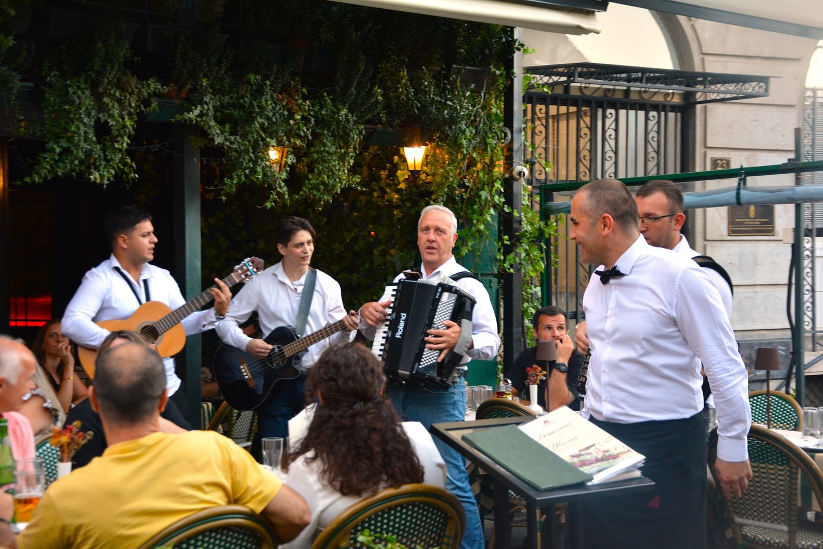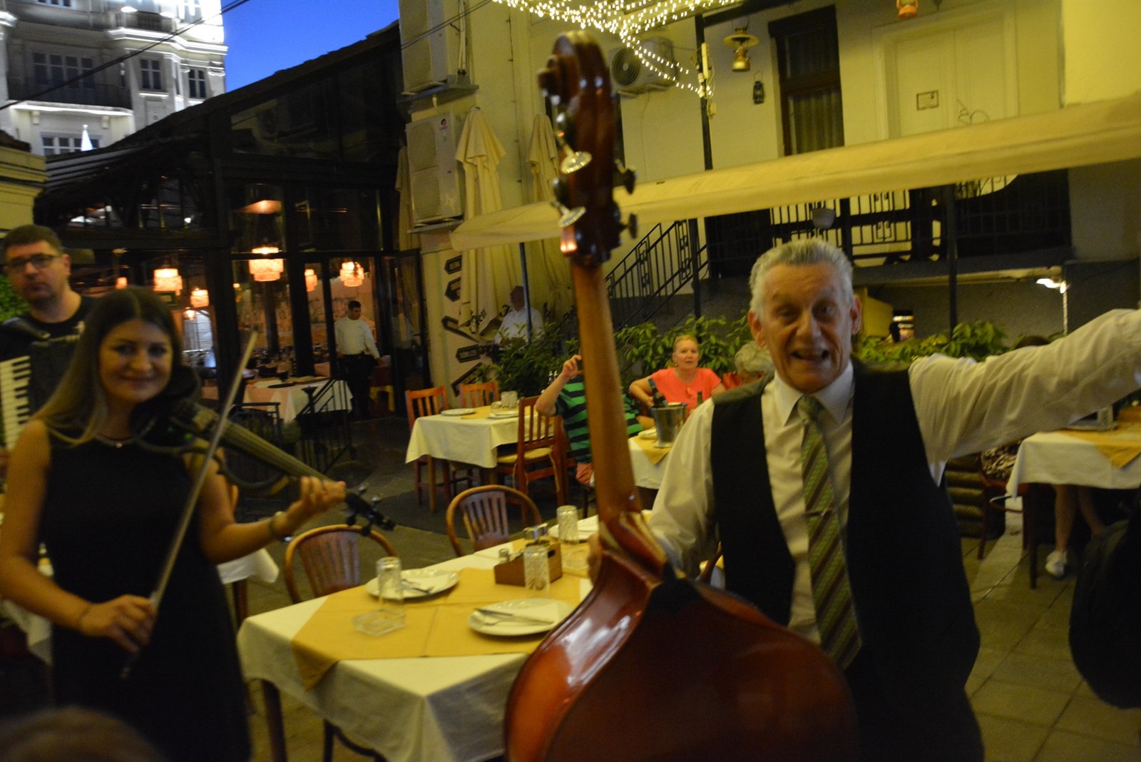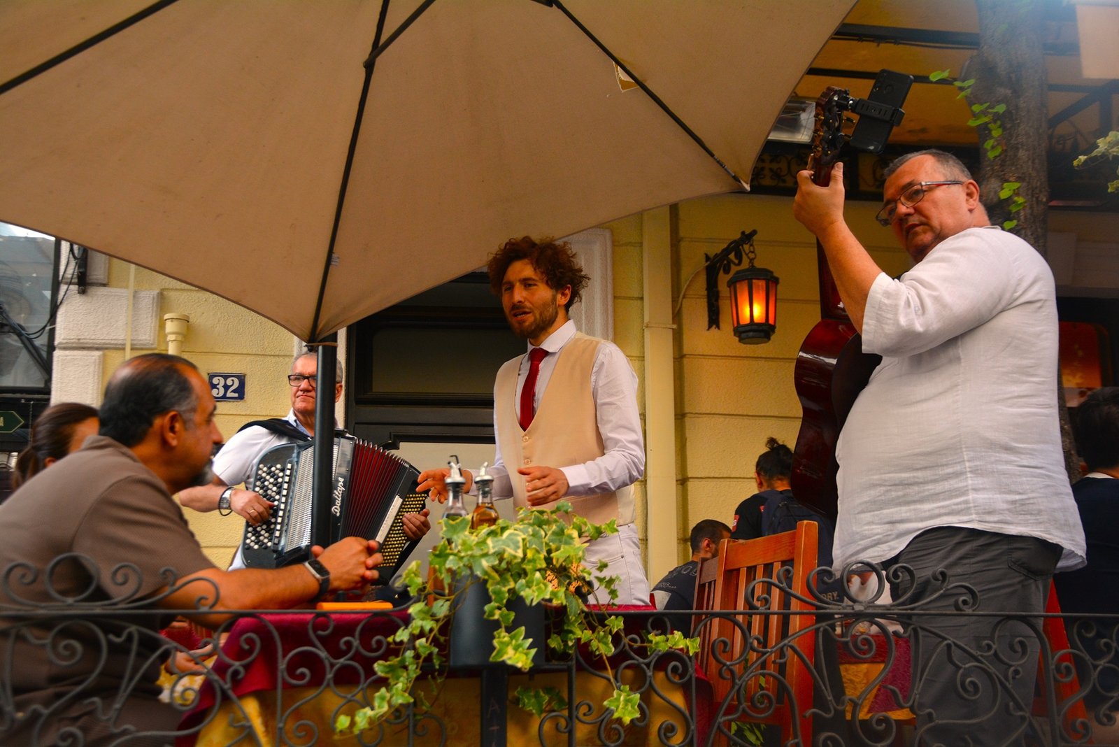 Καθώς πέφτει το βράδυ, ο δρόμος μεταμορφώνεται σε ένα ανοιχτό πάρτι. Οι παραδοσιακές μπάντες, γνωστές ως “orkestri”, γεμίζουν τα στενά με τους ήχους του ακορντεόν, του βιολιού και του κλαρινέτου. Παίζουν παραδοσιακή μουσική, γνωστή ως “Starogradska muzika” (μουσική της παλιάς πόλης), που συνδυάζει στοιχεία από τα Βαλκάνια, την Ανατολή και την Κεντρική Ευρώπη. Οι μουσικοί, περνώντας από τραπέζι σε τραπέζι, ενθαρρύνουν τους επισκέπτες να τραγουδήσουν και να χορέψουν, δημιουργώντας μια ατμόσφαιρα γεμάτη ζωντάνια και κέφι. Είναι αυτή η μοναδική αίσθηση του ανεπίσημου, της ζεστασιάς και της χαράς που κάνει τη Skadarlija τόσο ξεχωριστή.