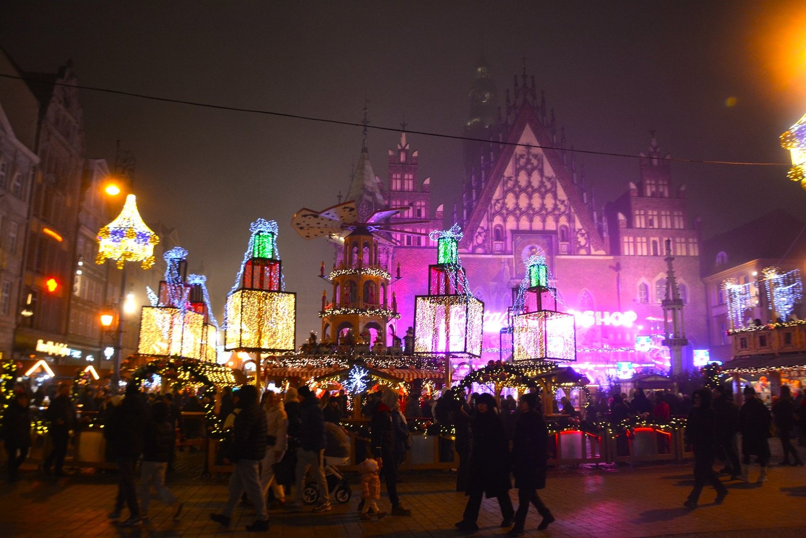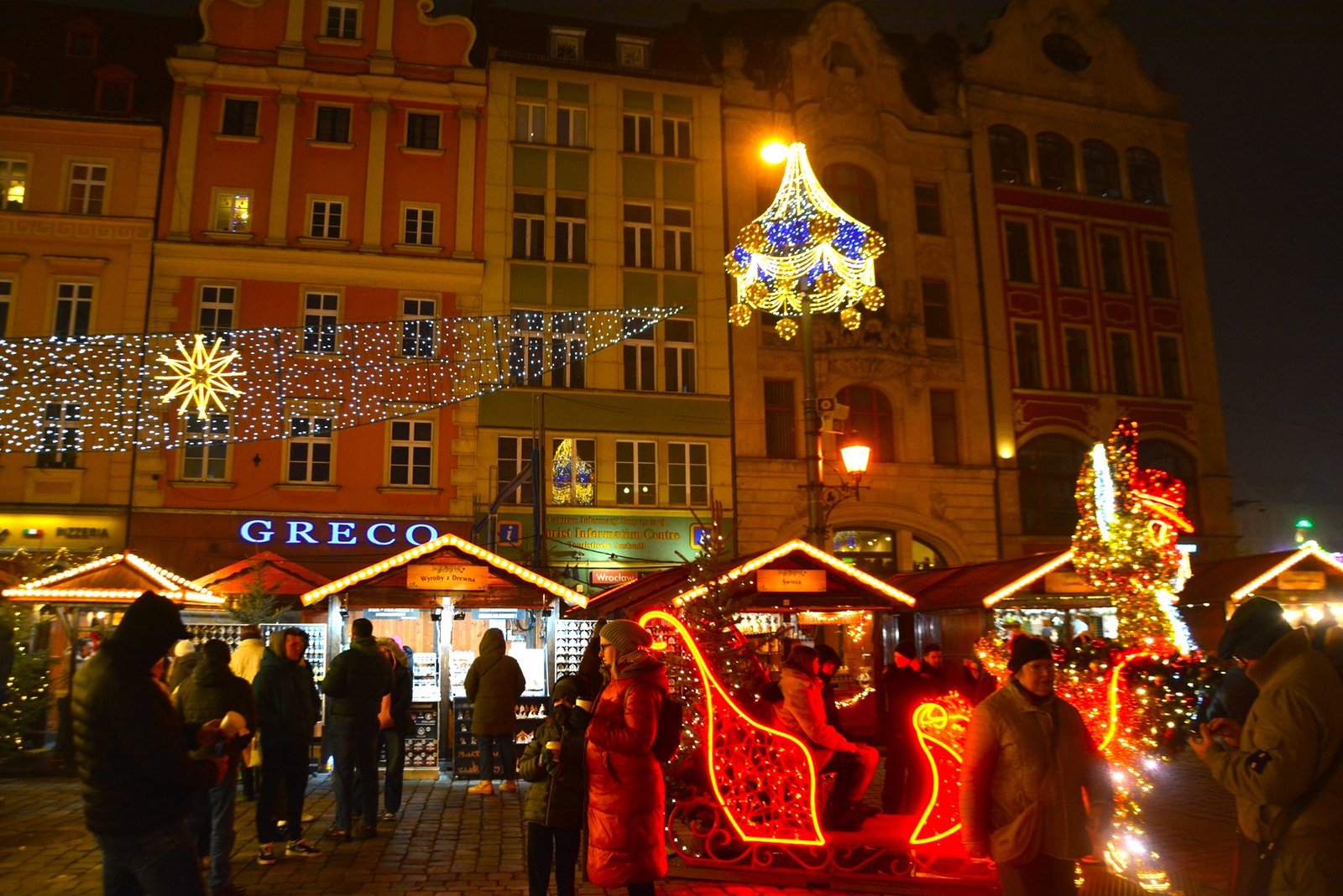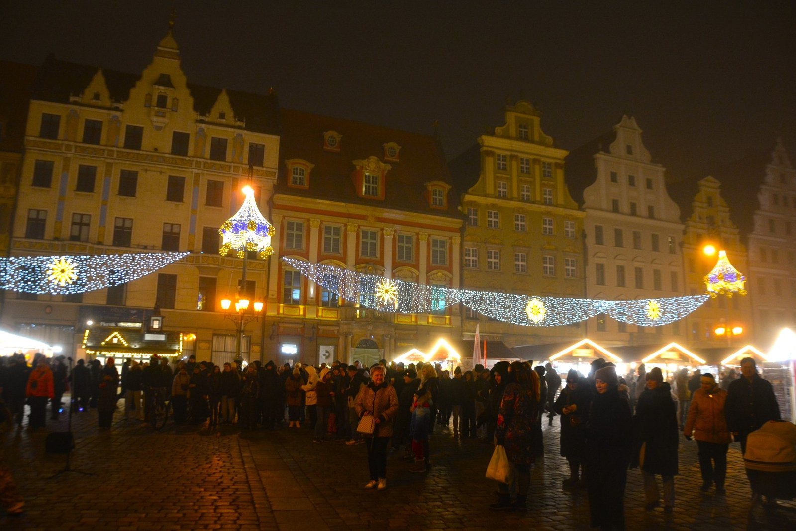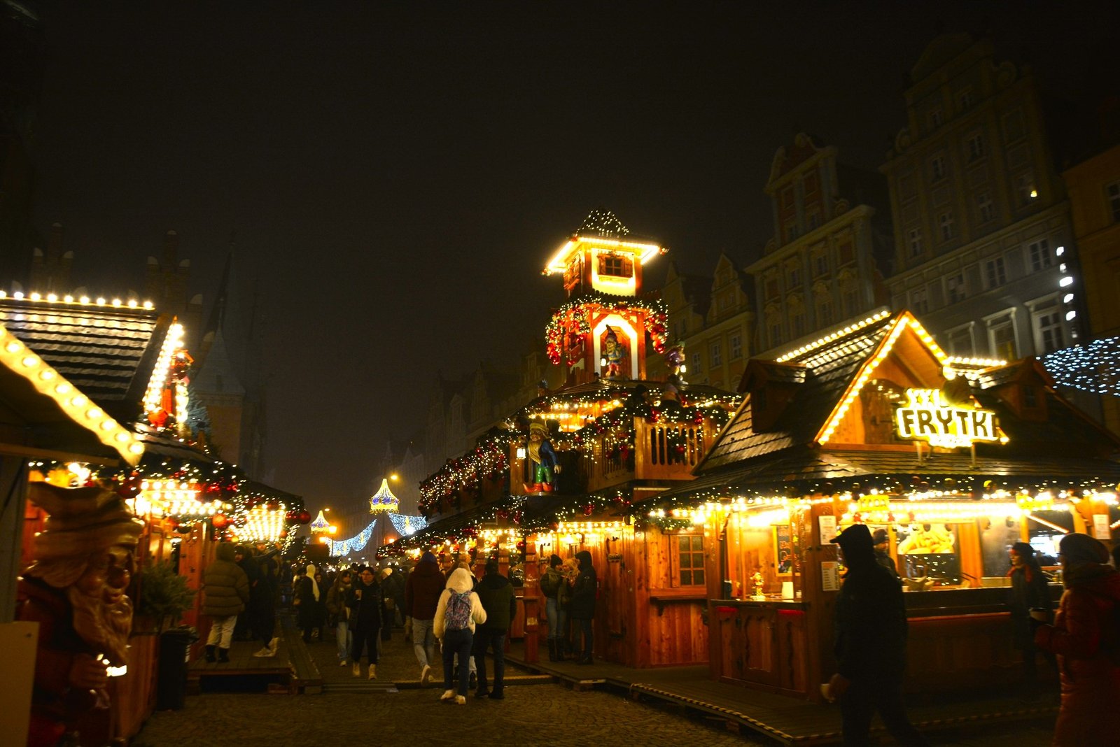 Οι στολισμοί είναι φαντασμαγορικοί. Οι πολύχρωμες, γοτθικές προσόψεις των κτιρίων φωτίζονται από χιλιάδες λαμπιόνια, ενώ το επιβλητικό Γοτθικό Δημαρχείο δεσπόζει στο κέντρο της γιορτής. Ένα τεράστιο, λαμπερό Χριστουγεννιάτικο Δέντρο στήνεται στην πλατεία, ενώ σε ειδικές κατασκευές, σκηνές από παραμύθια ζωντανεύουν, κάνοντας την ατμόσφαιρα ιδανική για οικογένειες. Ακόμα και οι διάσημοι νάνοι του Βρότσλαβ συμμετέχουν στη γιορτή, με πολλούς από αυτούς να ντύνονται με χριστουγεννιάτικες ενδυμασίες ή να κρατούν γιορτινά δώρα.